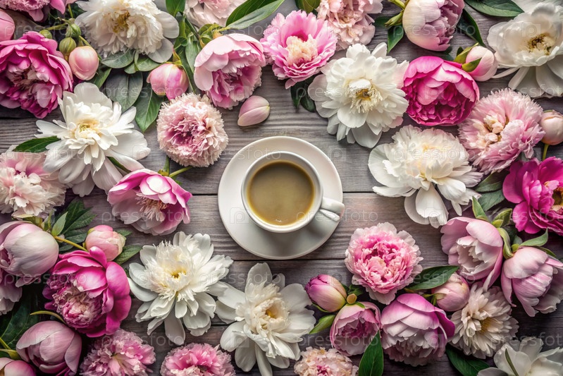 открытка. чашка кофе с тарелкой и белые розовые пионы. красивая натюрмортная картина. весна, лето. приятное утро концепция
