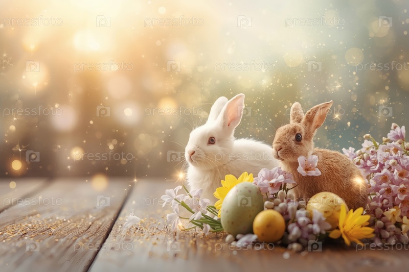 Пасхальные яйца, пасхальный кролик и весенние цветы на деревянном фоне. Концепция яркого праздника Пасхи в 2026 году. Хорошая открытка. Баннер