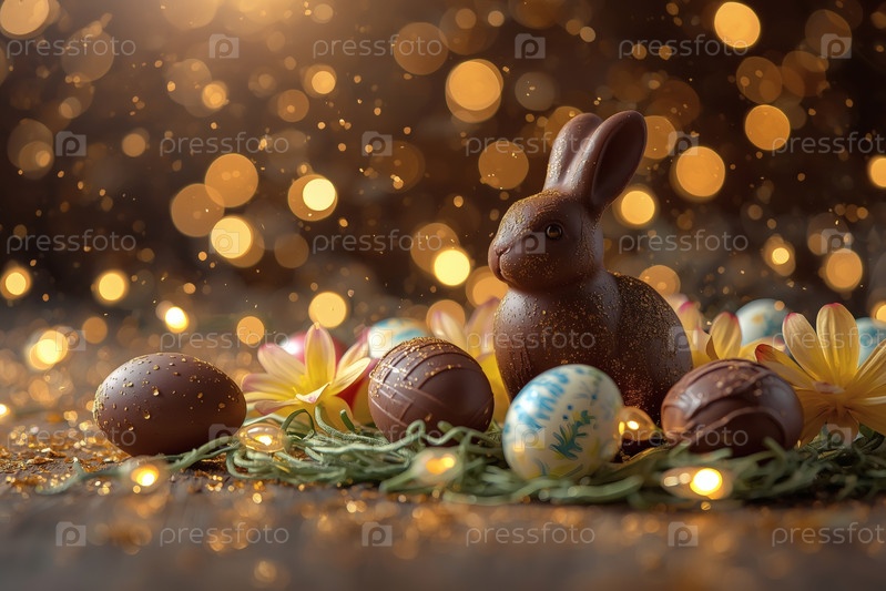 Шоколадное пасхальное яйцо, шоколадный кролик и весенние цветы на деревянном фоне. Пасхальные сладости и лакомства. Концепция яркого праздника Пасхи в 2026 году. Хорошая открытка