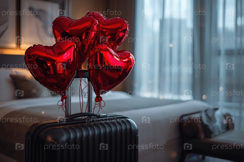 Балонный чемодан в форме сердца в гостиничном номере, чтобы отпраздновать День святого Валентина.Романтический праздник для двух любовников, действие 14 февраля