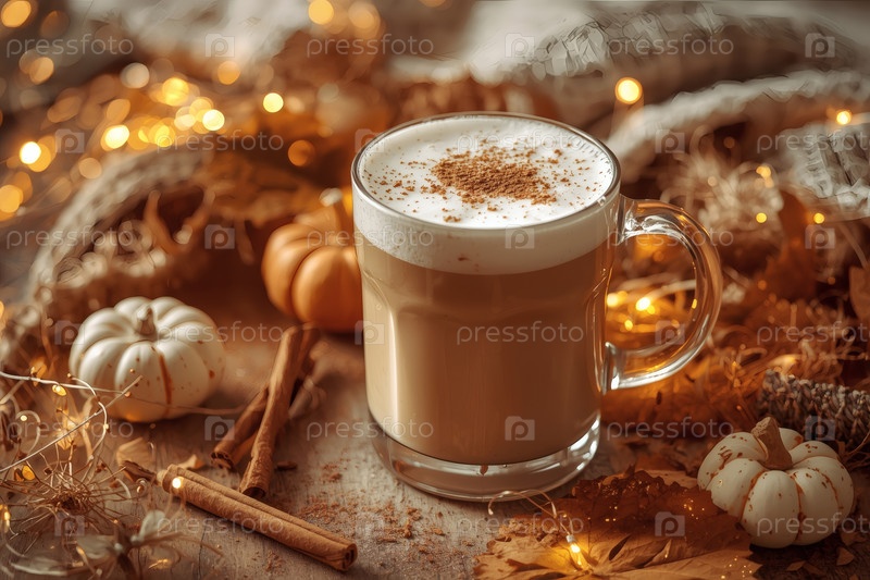 Вкусное тыквенное латте в стеклянной кружке, тыквы и осенние листья на деревянном столе. Сезонные напитки. вкусный горячий капучино или латте. Осенний баннер