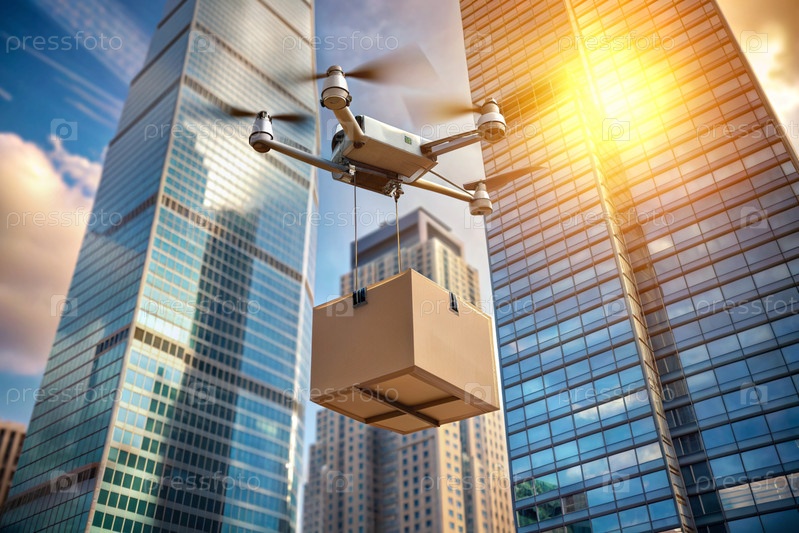 Технология будущего. Дрон доставки несет картонную коробку для человека на веревке. Дрон доставки летает между современными небоскребами. Концепция развития доставки товаров