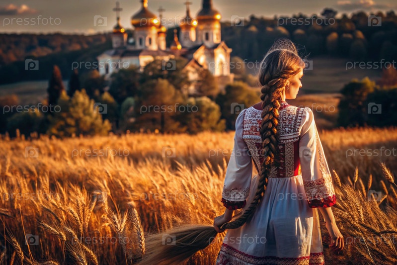 Девушка в традиционном русском льняном наряде и с сковородой на голове на поле спелой золотистой пшеницы на фоне березы и православной церкви