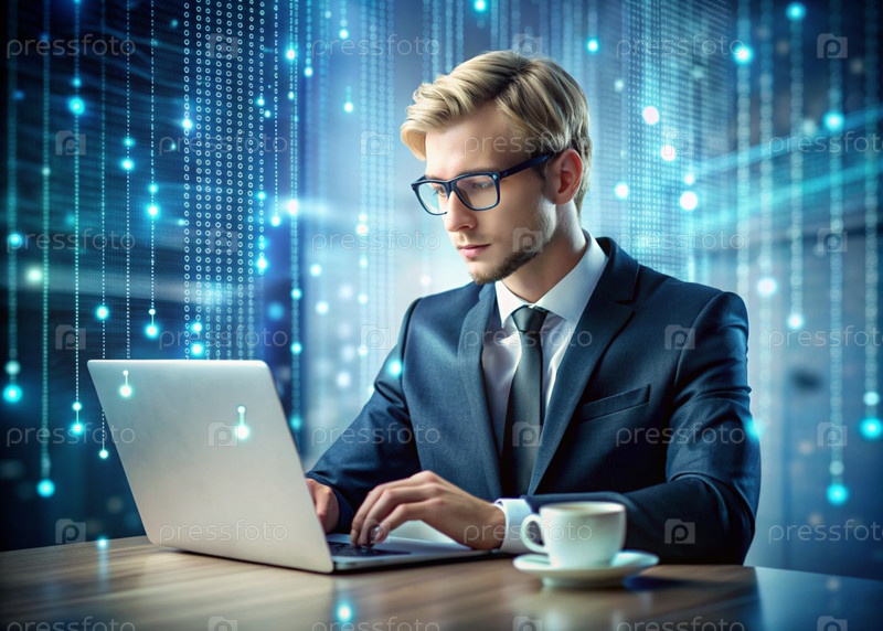 Молодой человек в костюме работает на ноутбуке в офисе с цифровыми кодами на виртуальном экране Цифровые технологии будущего Разработка программного обеспечения