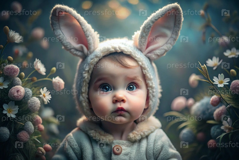 Баннер. Винтажная открытка. Девушка в костюме пасхального кролика с милыми ушами. Концепция праздника Bright Easter Spring