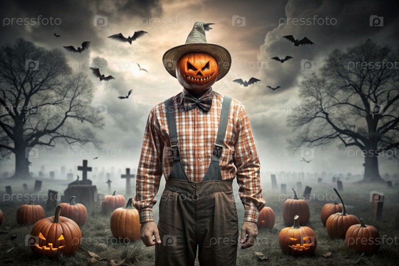 Концепция Хэллоуина. Ужасная. Страх. Устрашающий богий с тыквенной головой, квадратной рубашкой и бабочкой. Баннер, открытка