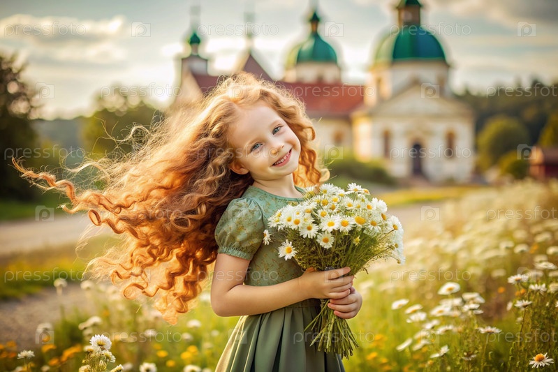 Всероссийский День семьи, любви и верности Красивая маленькая кудрявая девочка с букетом ромашек на фоне Православной церкви День святого Валентина Петра и Февронии