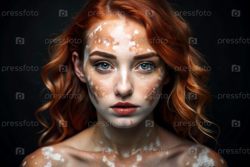 Лейкодермия. Витилиго. Плохая пигментация кожи. Большие белые пятна по всему телу и лицу. Портрет красивой девушки с кожными заболеваниями