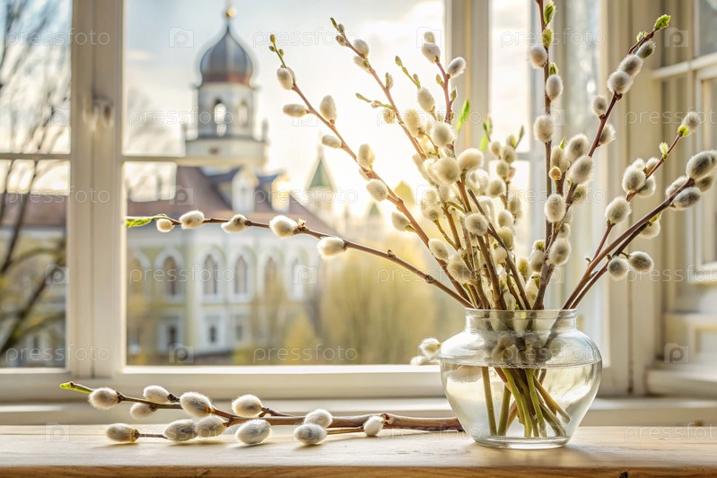 Большой план букета ивы в стеклянной вазе на фоне древнего белого окна с видом на золотые куполы храма и заходящее солнце