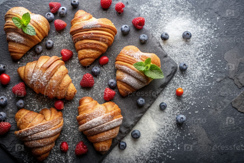 Вкусные свежевыпеченные кроассанты и ягоды в форме сердца на тёмном фоне сланцевого камня. французский завтрак. хорошие ближневые выпечки. пекарня со вкусным хлебом. кондитерские изделия
