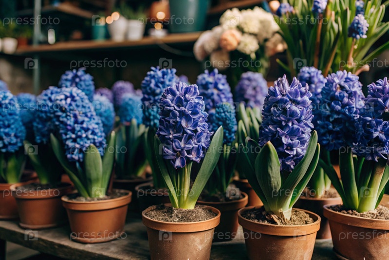 Голубые гиацинты в стильных глиняных горшках на яркой витрине цветочного рынка идеально подходят для украшения домашних садов ранней весной