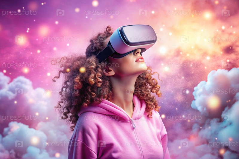 Красивая молодая девушка в розовом капюшоне играет в виртуальную реальность на сказочных розовых облаках с гарнитурой виртуальной реальности перед глазами