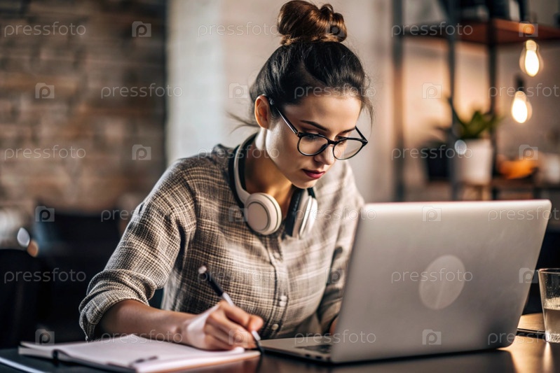 Молодая женщина фрилансер в очках и наушниках работает на ноутбуке или делает покупки в интернет-магазине