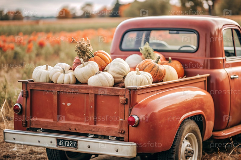 Осень, осенний дизайн.Большой урожай тыквы на заднем сиденье ретро-пикапа, крупный план