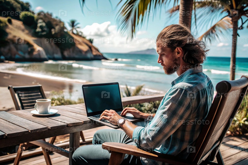 Молодой бизнесмен-фрилансер работает на ноутбуке, отдыхая у моря или делая покупки в Интернете
