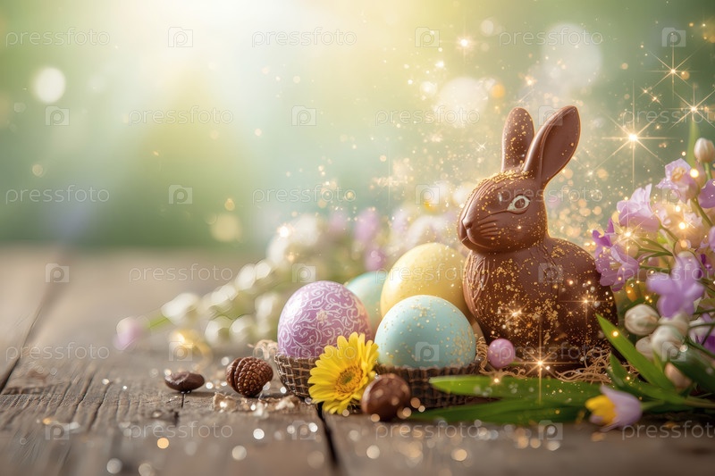 Шоколадное пасхальное яйцо, шоколадный кролик и весенние цветы на деревянном фоне. Пасхальные сладости и лакомства. Концепция яркого пасхального праздника в 2026 году. Хорошая открытка. Баннер