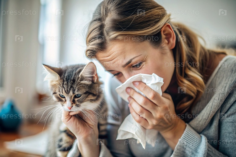 Женщина чихает в белую салфетку дома. Аллергия на волосы кошек и домашних животных. Рядом со мной кот