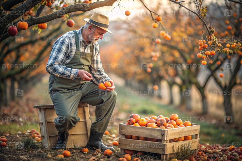 Сельскохозяйственная промышленность. Деревянный ящик с персимом в руках фермера-мужчины. Садовник собирает богатый урожай. Ближе, солнечный свет. Осенний плодовый сбор
