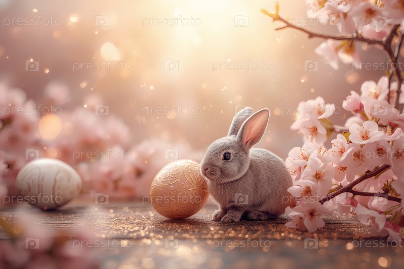 Концепция яркого пасхального праздника в 2026 году.Концепция ярких пасхальных праздников.Нежные розовые пасхальные яйца, кролики и вишневые ветви на деревянном фоне