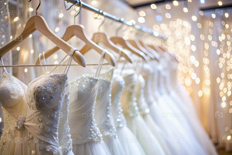 Аренда и покупка свадебных платьев для мероприятий. Близкие. Свадебные белые платья висят с белых вешалок на стойке в свадебном салоне магазина