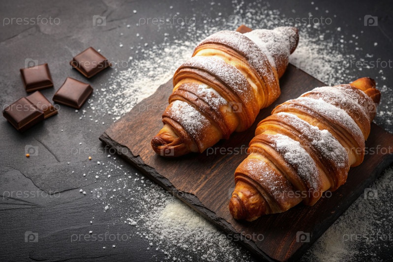 Вкусные свежевыпеченные кроассанты на тёмном фоне сланца. французский завтрак. хорошие ближневые выпечки. пекарня со вкусным хлебом. кондитерские изделия