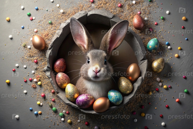 Известный праздник. милый пасхальный кролик заглядывает из ямы с красочными яйцами вокруг. концепция счастливой Пасхи
