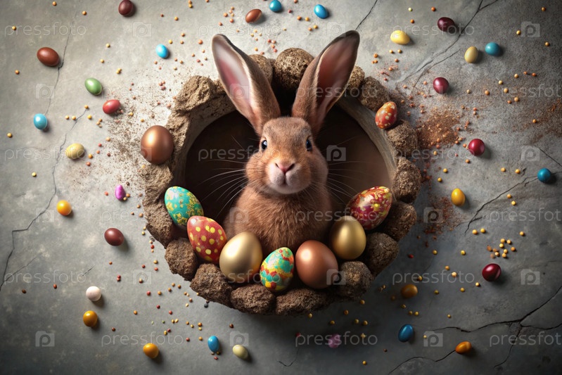 Известный праздник. милый пасхальный кролик заглядывает из ямы с красочными яйцами вокруг. концепция счастливой Пасхи