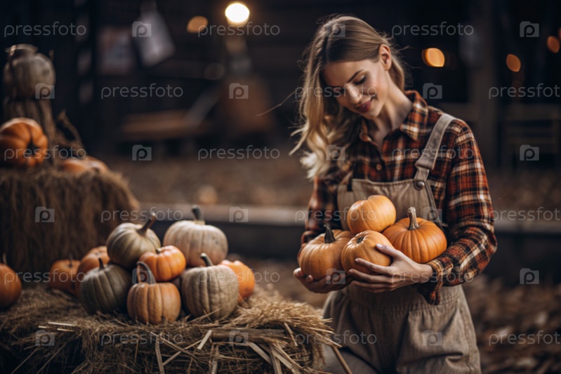 Руки женщины в квадратной рубашке с тыквенным крупным планом и красивым осенним рисунком. Сбор тыков. Концепция празднования Дня благодарения и Хэллоуина