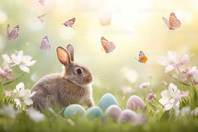 Концепция счастливой Пасхи в 2026 году. праздничная открытка или баннер. пасхальные кролики лежат на пасхальных яйцах и пялятся в камеру