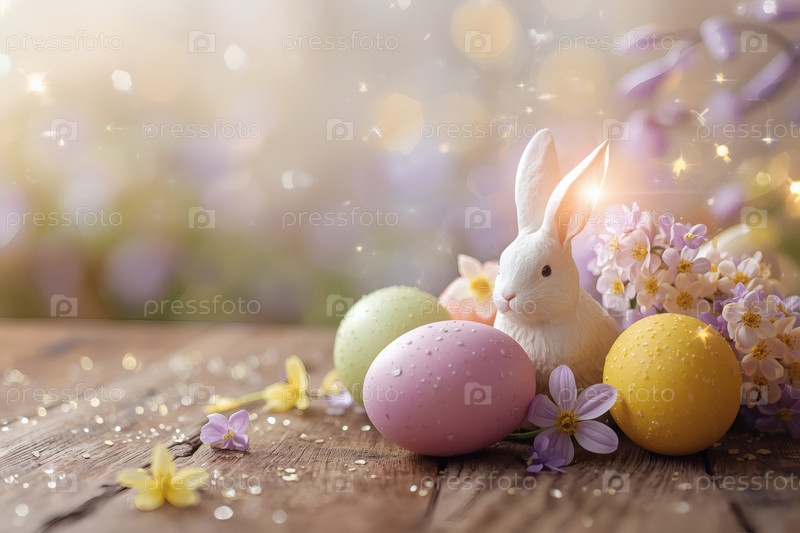 Пасхальные яйца, видео и весенние цветы на деревянном фоне. Концепция яркого пасхального праздника в 2026 году. Хорошая открытка. Баннер