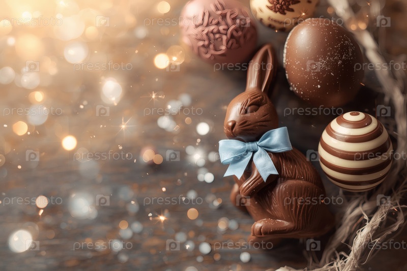 Концепция ярких пасхальных праздников в 2026 году. Красивая открытка. Баннер. Шоколадные пасхальные яйца и шоколадное зайцо на деревянном фоне. Пасхальные сладости и лакомства