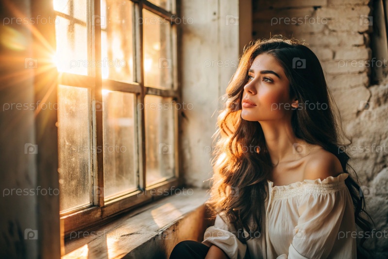 Портрет красивой девушки с кудрявыми волосами у окна старого дома, в котором светит теплое яркое солнце. Романтическое изображение. Одиночество, пустота и ожидание