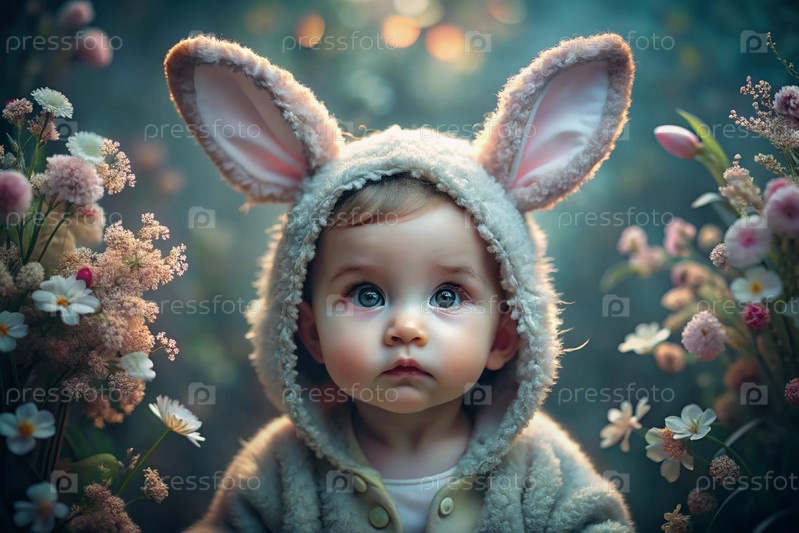 Баннер. Винтажная открытка. Девушка в костюме пасхального кролика с милыми ушами. Концепция праздника Bright Easter Spring