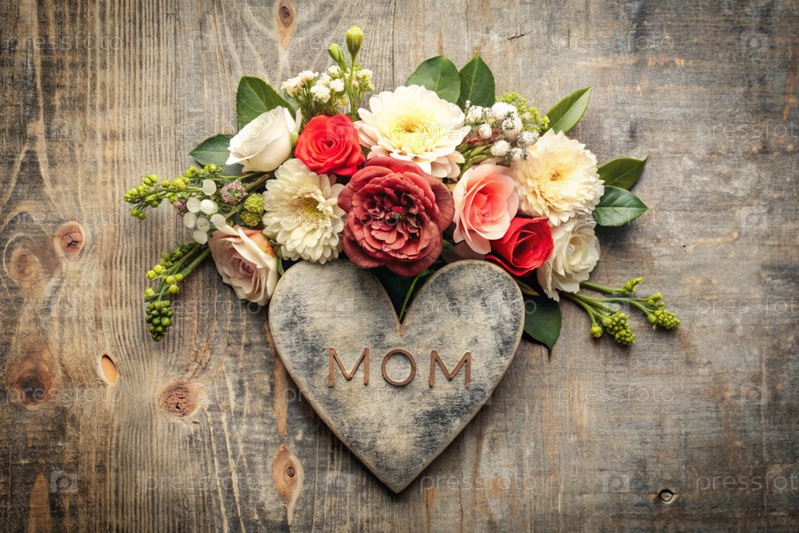 Открытка, баннер Дня матери с красными цветами, сердца на винтажном сером деревянном фоне