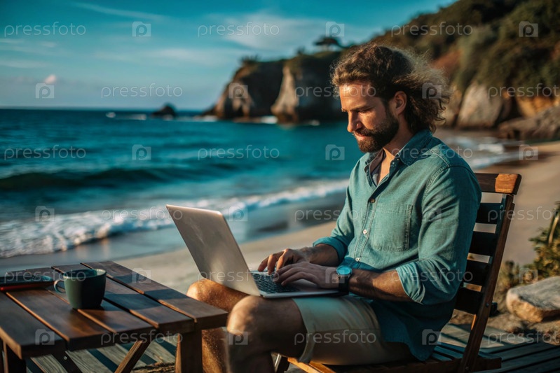 Молодой бизнесмен-фрилансер работает на ноутбуке, отдыхая у моря или делая покупки в Интернете