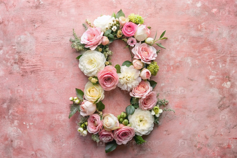 Международный женский день. баннер, флаер. праздничный цветочный фон в розовых тонах с номером 8