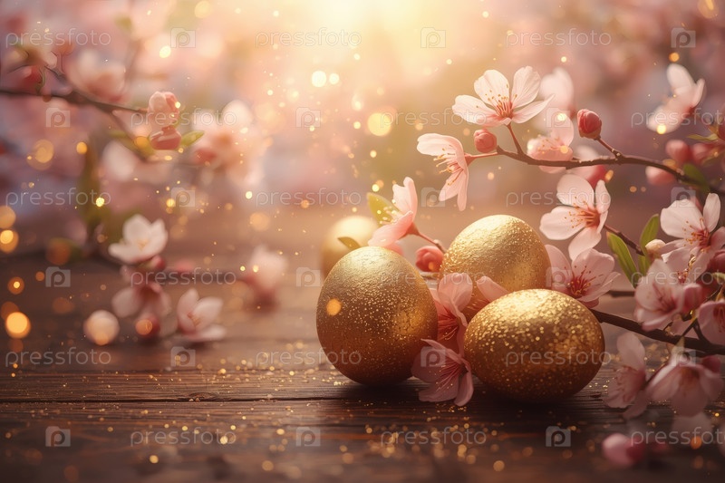 Концепция яркого пасхального праздника в 2026 году.Нежные розовые пасхальные яйца и вишневые ветви на деревянном фоне