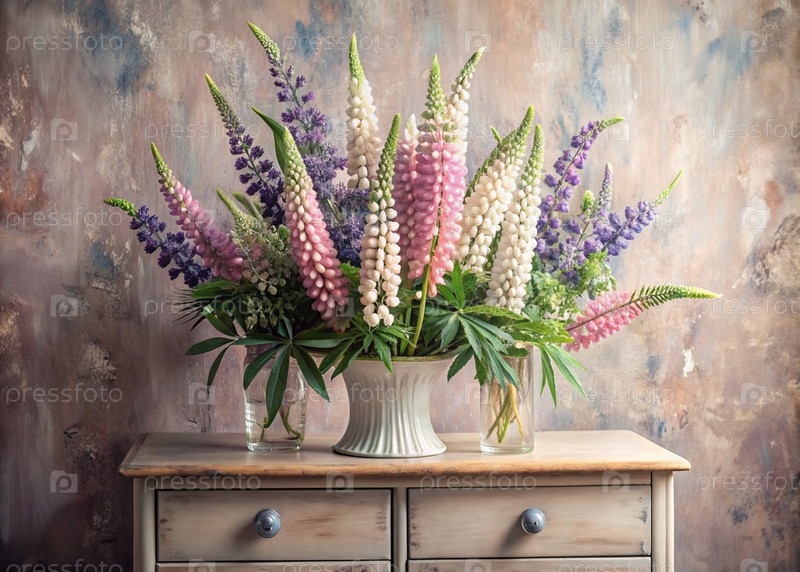 Красивый букет розовых, белых и фиолетовых люпин в стеклянной вазе и флаконы на старом деревянном шкафу. Букет цветов в вазе в интерьере дома. Светлый, бежевый, розовый, фиолетовый, цветный фон
