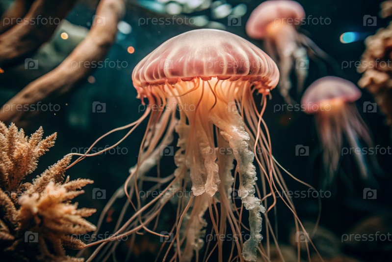 Скуба дайвинг. Дайвинг. Красочные медузы плавают в тропических водах. Медузы в подводном мире диких животных. Наблюдение за океанической фауной