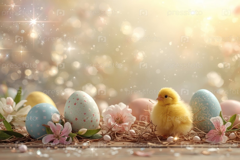 Пасхальные яйца, желтая курица и весенние цветы на деревянном фоне. Концепция яркого пасхального праздника в 2026 году