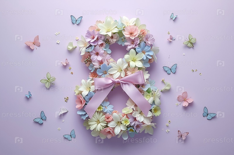 Международный женский день. баннер, флаер, красивая открытка на 8 марта. цветы в форме цифры восемь и бабочки на лиловом фоне