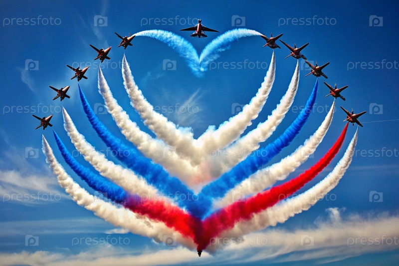 Концепция празднования Дня России 12 июня.Военные самолеты рисуют сердце в цвета российского триколорного дыма на небе.Белый, синий, красный дым
