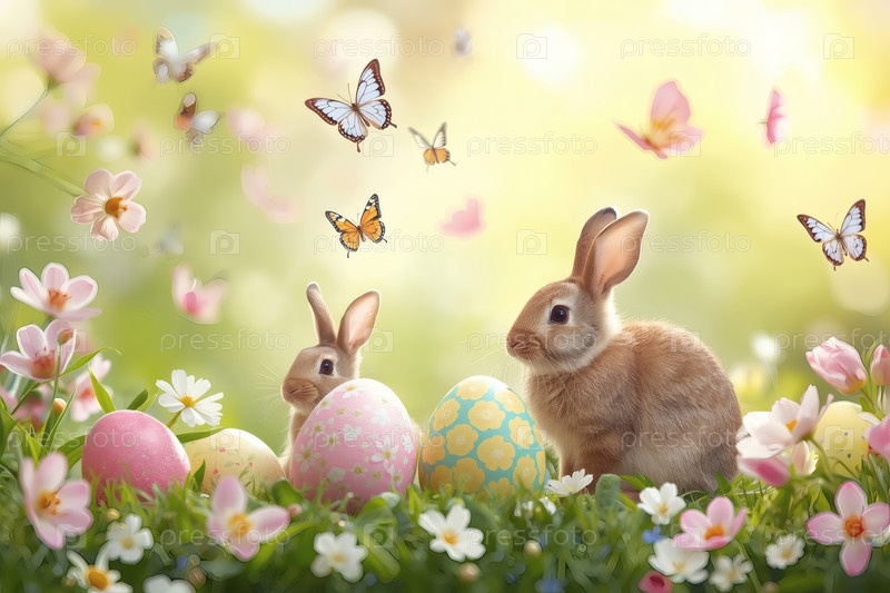 Концепция счастливой Пасхи в 2026 году. праздничная открытка или баннер. пасхальные кролики лежат на пасхальных яйцах и пялятся в камеру