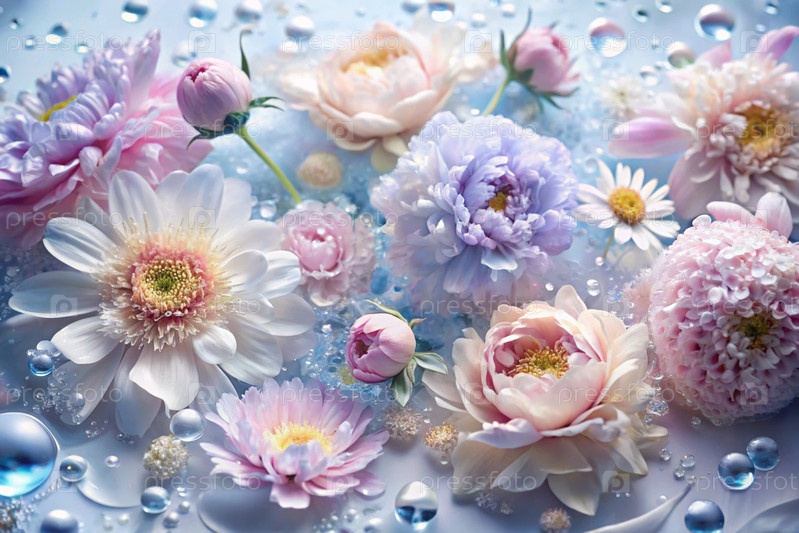 Красивый, воздушный, деликатный цветочный фон в синих и розовых тонах. цветы пиона, хризантемы, ромашки с каплями воды на лепестках
