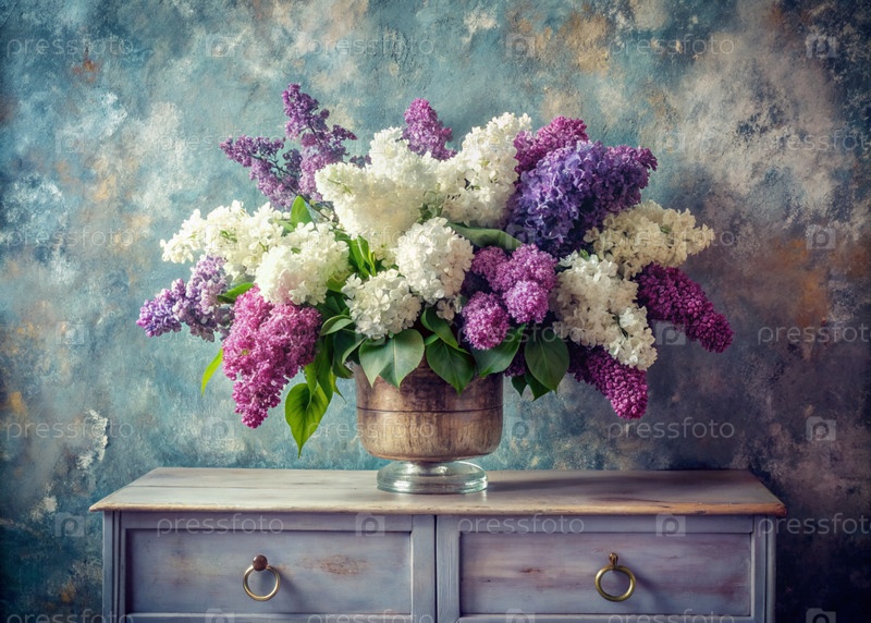 Красивые белые и фиолетовые лиловые цветы в стеклянных вазах и бутылках на деревянном шкафу. Букет цветов в вазе. Светлый, белый, розовый и синий цветочный фон