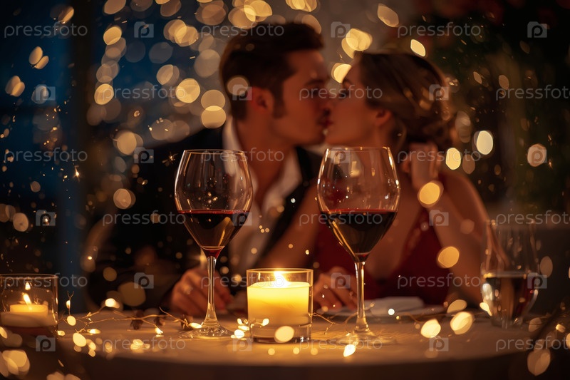 Концепция Дня святого Валентина: элегантная пара, целующаяся на романтическом ужине при свечах с бокалами вина в роскошный вечер