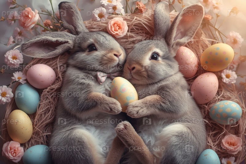 Пасхальные кролики лежат на пасхальных яйцах и смотрят в камеру. праздничная открытка или баннер. счастливая Пасхальная концепция в 2026 году