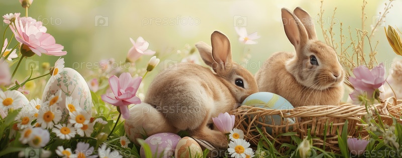Пасхальные кролики лежат на пасхальных яйцах и смотрят в камеру