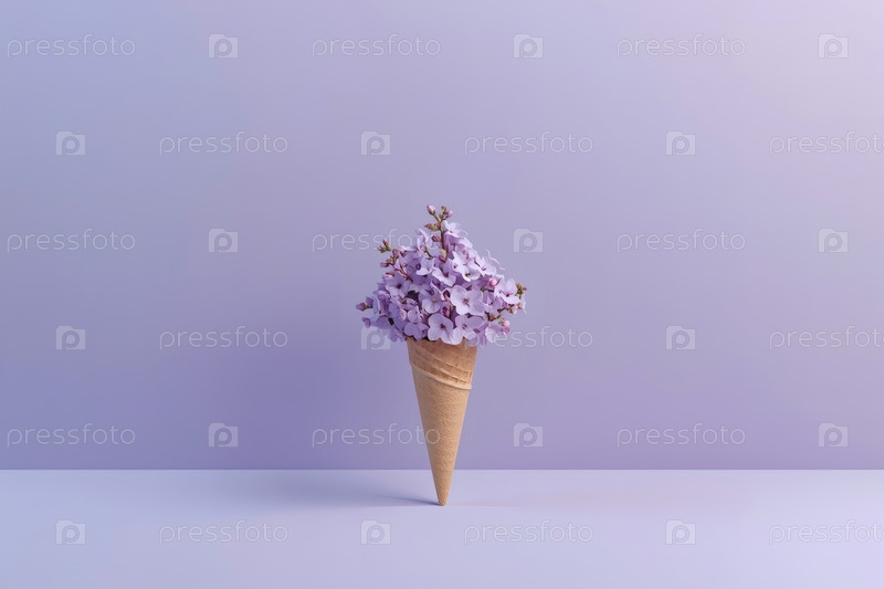 Минимальная студийная фотография. Вафельное мороженое. Наполнено нежными лиловыми цветами, с многослойными лепестками мягкого лила и синими оттенками на фиолетовом фоне