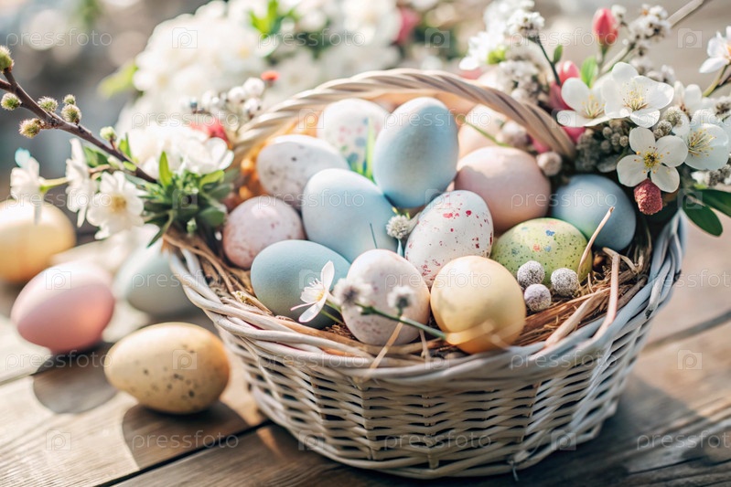 Пасхальные яйца и весенние пасхальные цветы в плетеновой корзине, концепция праздника Пасхи